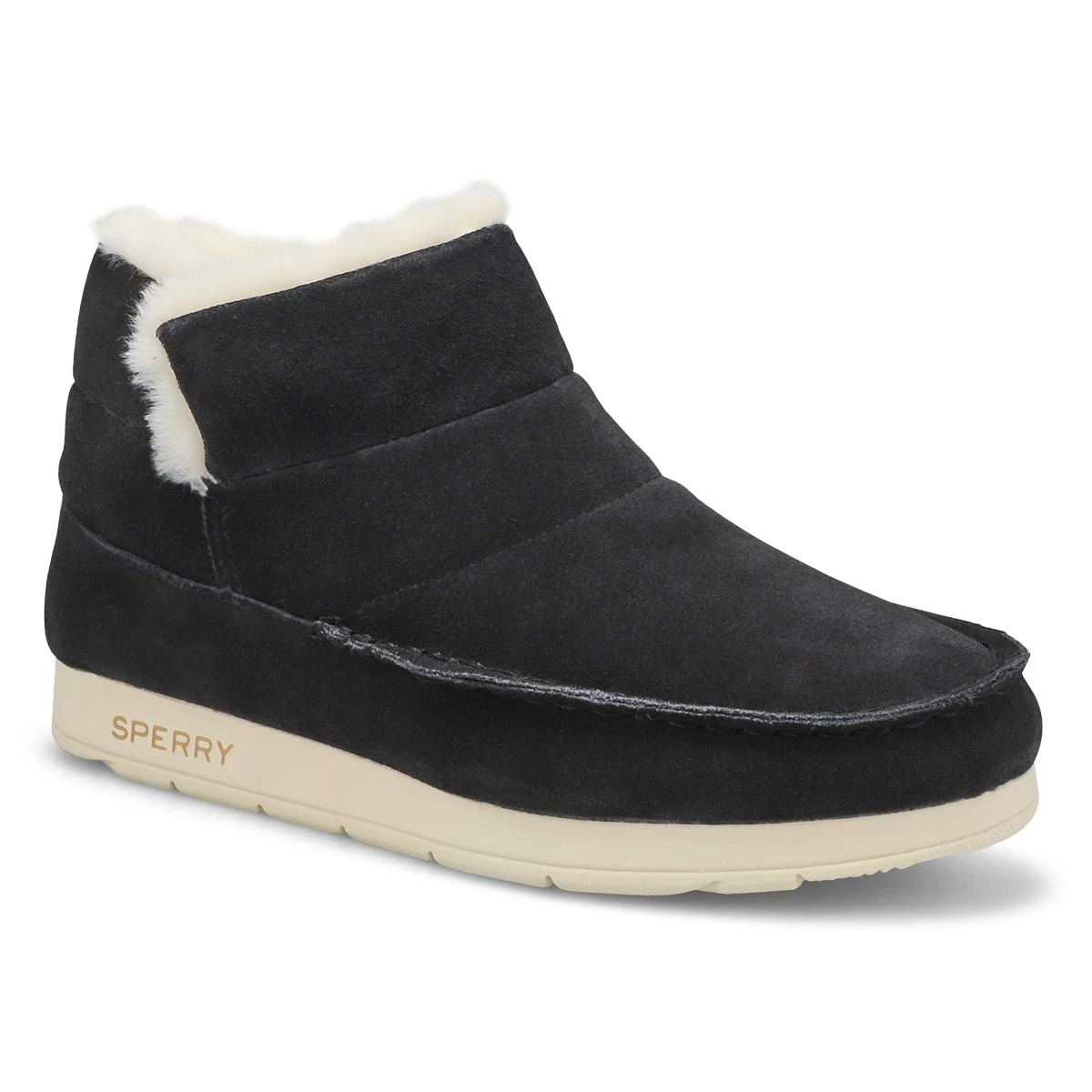 Designed to be a seasonal favorite, the Moc-Sider Bootie black Suede boot from Sperry Top-Sider features a microfleece lining and premium suede uppers for cozy yet chic style. Padded contruction for that comfort feeling. Box stitch and additional boat shoe-inspired details. Plus, an EVA outsole adds comfort and traction to all your indoor and outdoor adventures.